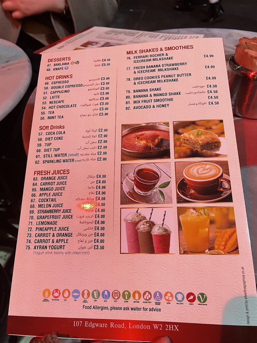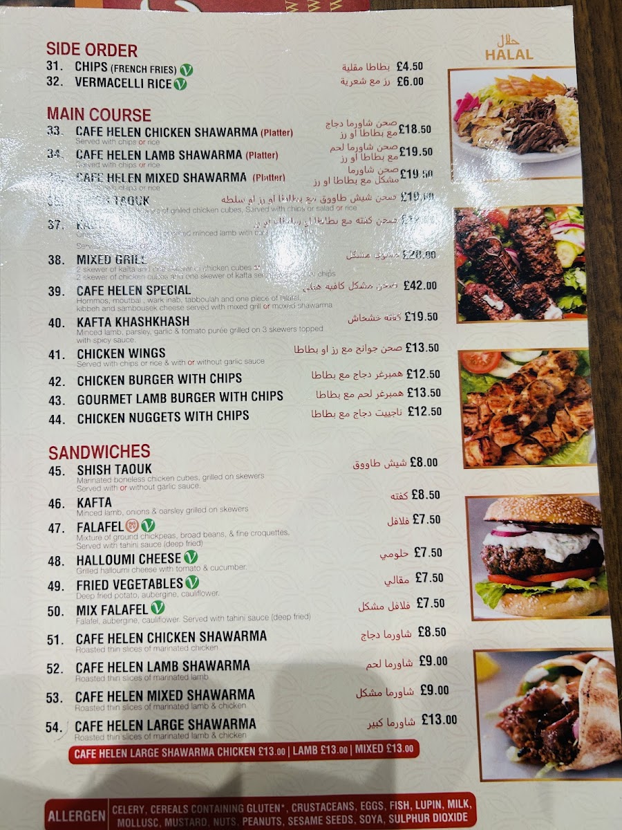 “ Casually visited cafe Helen, while being around Edgware Road yesterday. My friends have been coming here for years and always praised their shawarma wraps,especially the mixed one, so definitely I had to try. I started with the chicken shawarma as my first choice, followed by the mixed shawarma. The ingredients were fresh, and the meat and chicken delicious. Service was friendly and attentive, and the only reason I'm giving 4 stars is because there wasn't enough sitting area( only a few counter top spots), and the shop or more specifically this part of the whole Cafe Helen was small in size. On another topic, next door there were lots of sitting areas in, and outside the shop which appeared to be an extension of cafe Helen. They had desserts, drinks, milkshake, coffee and shisha as well. Price wise I would consider their menu on the moderate side, not cheap but not super expensive. ”